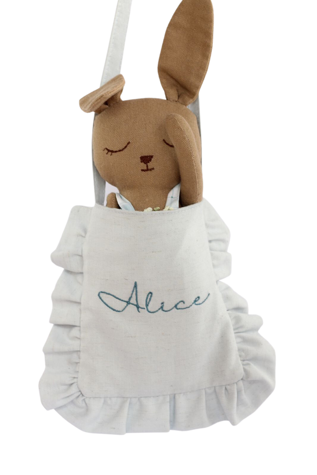 Nossa coelha camponesa que ama a natureza. Personalize a jardineira e a bolsinha.